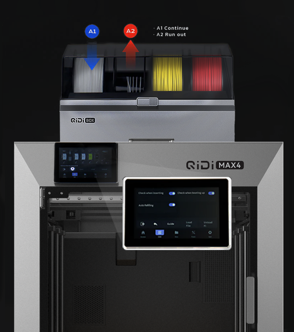 The QIDI Box features a built-in chamber heating up to 65°C, gently softening advanced filaments for smooth, vibrant multi-color prints every time