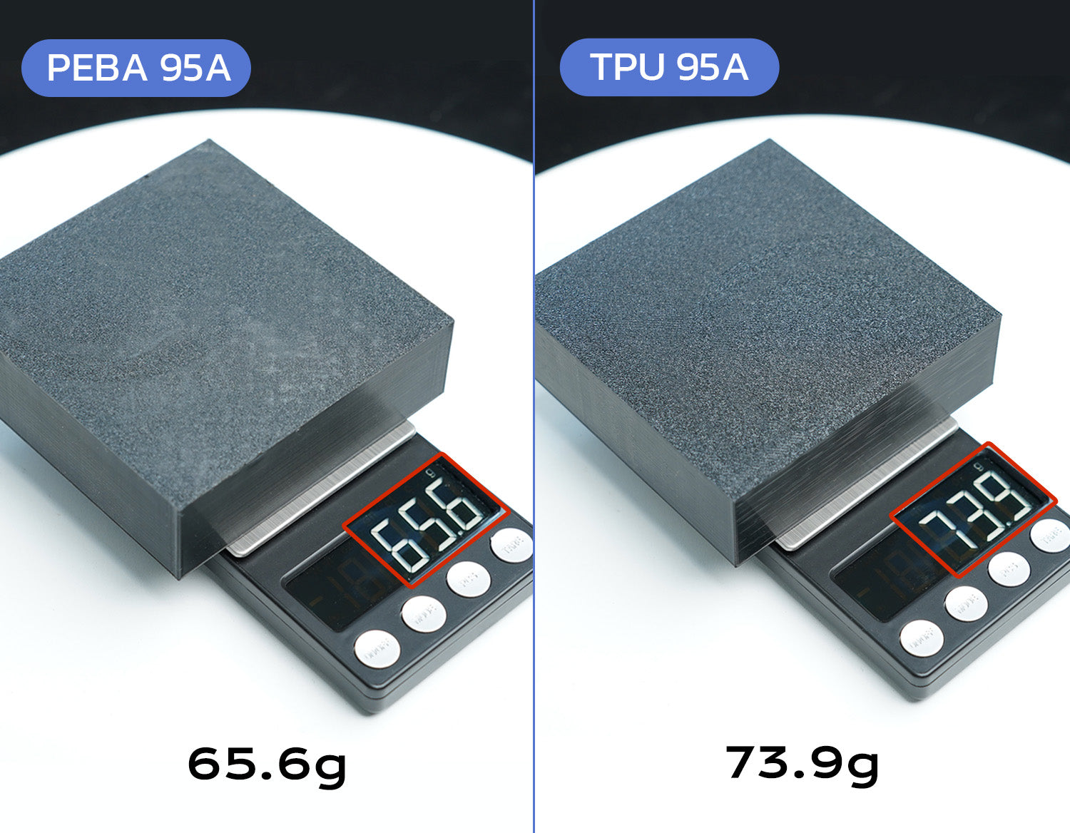 Engineered for weight-sensitive applications, PEBA is over 12% lighter than standard TPU 95A. It significantly reduces the overall weight of parts without compromising strength, making it the top choice for pro-grade sports gear and aerospace components.